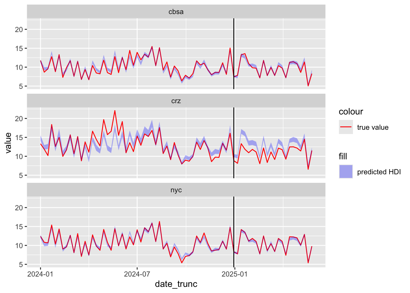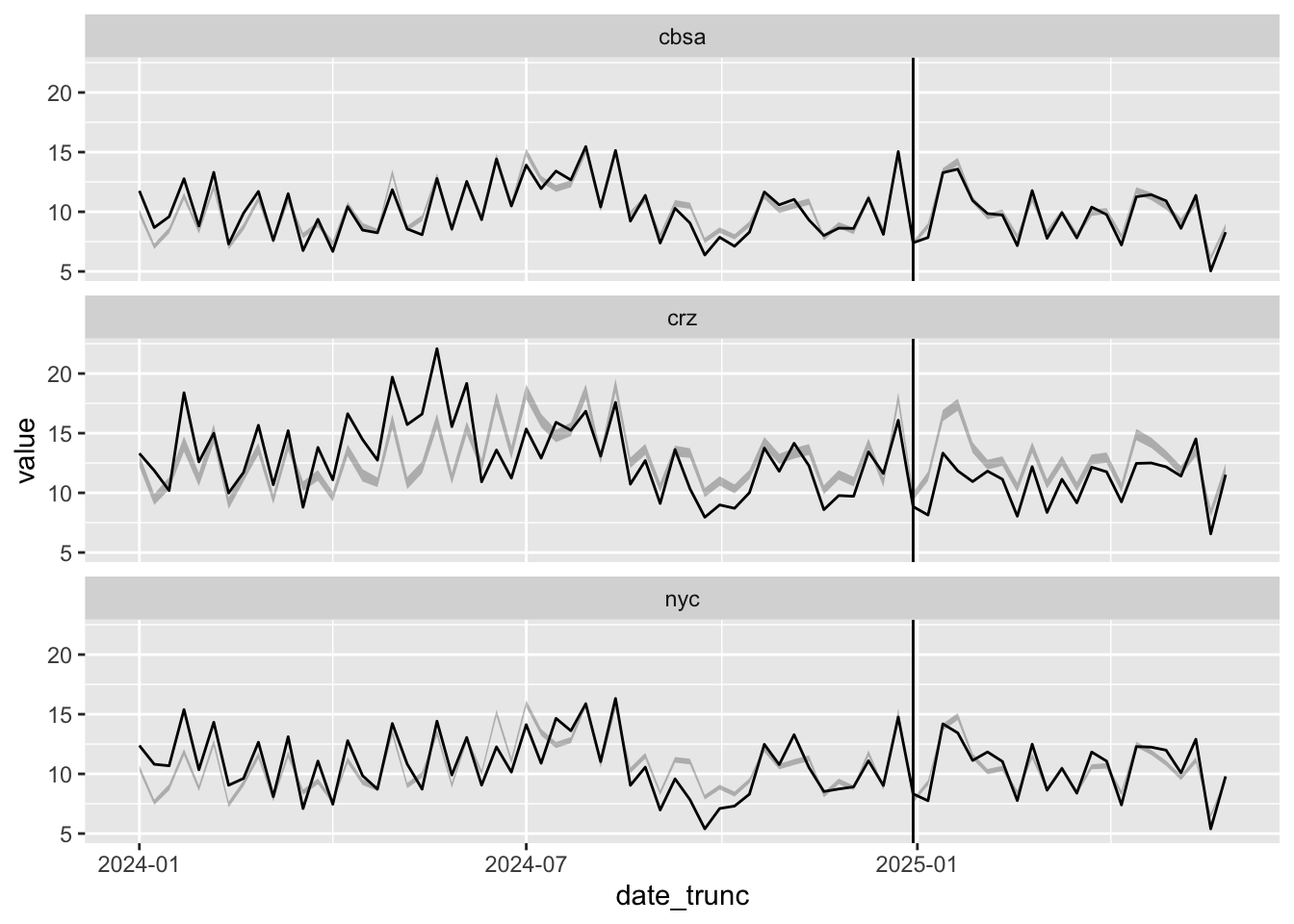 ggplot(aes(date_trunc, value, ymin=pred_lo, ymax=pred_hi)) +