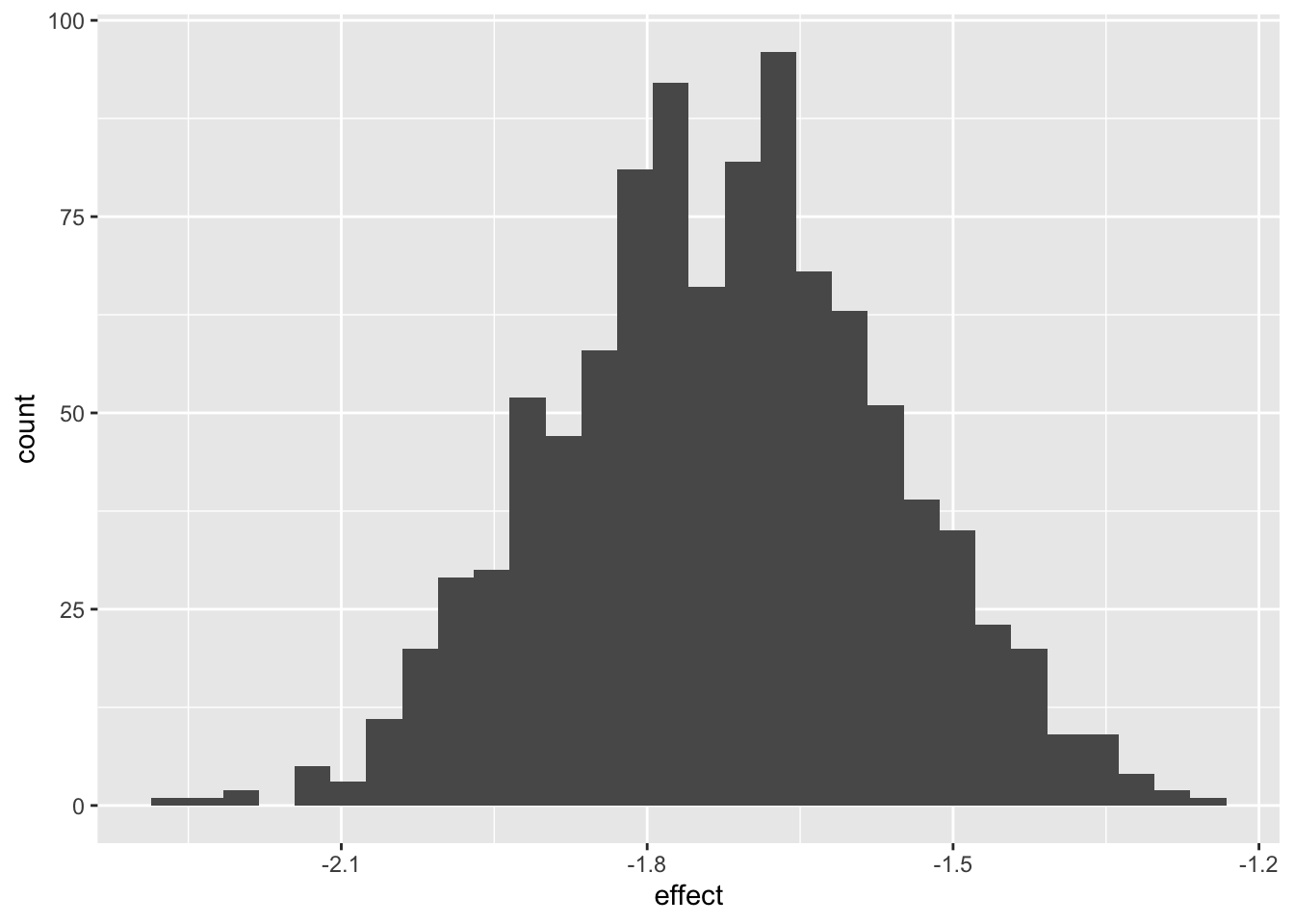 ggplot(aes(effect)) + geom_histogram()