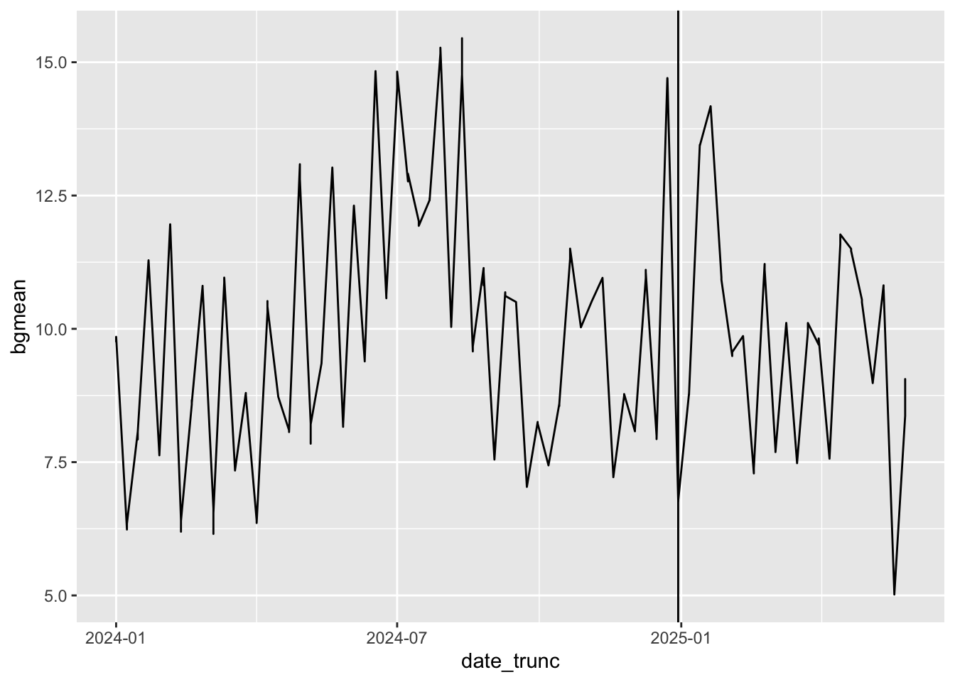 ggplot(aes(date_trunc, bgmean)) + geom_line() + geom_vline(xintercept = tdate)