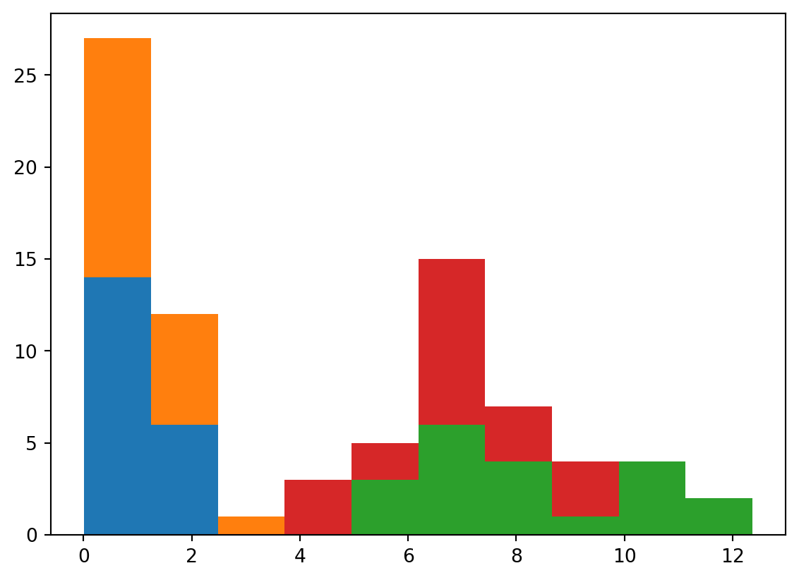 return obs_liky = trans_val(true_z)plt.hist(list(jnp.reshape(y, (4, 20))), stacked=True);