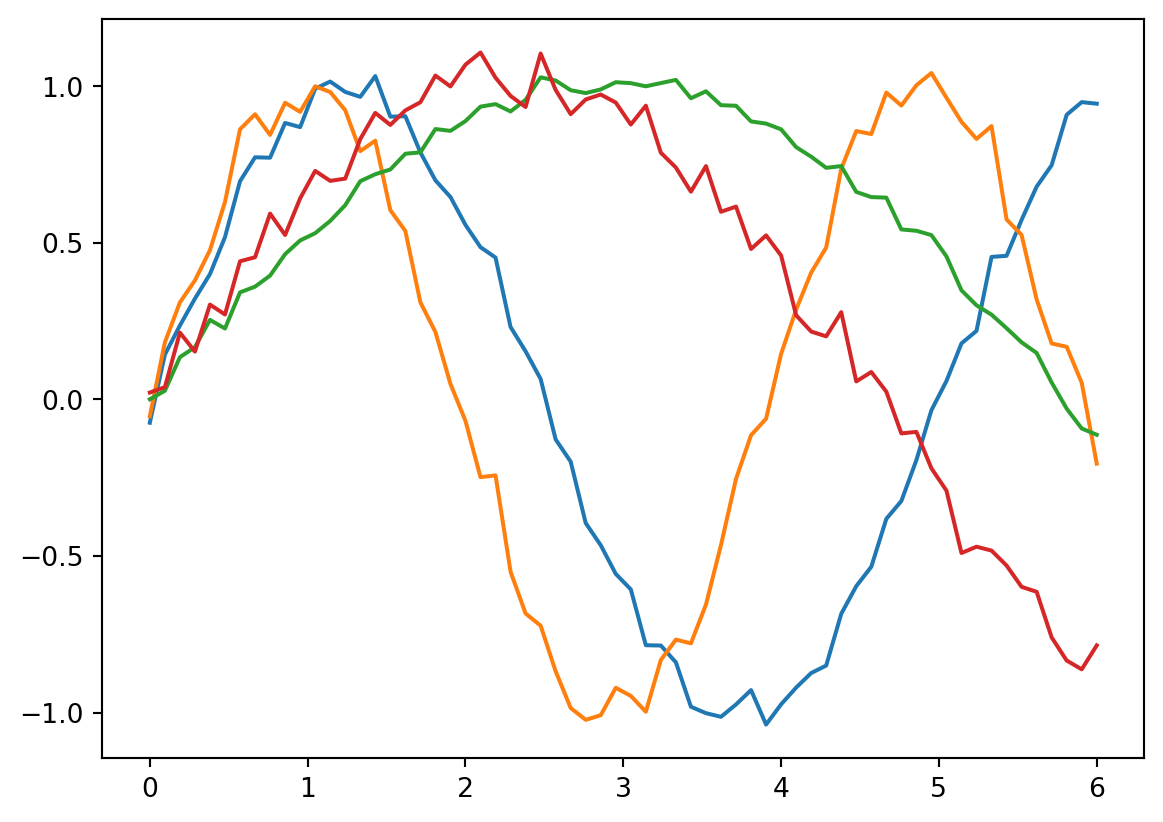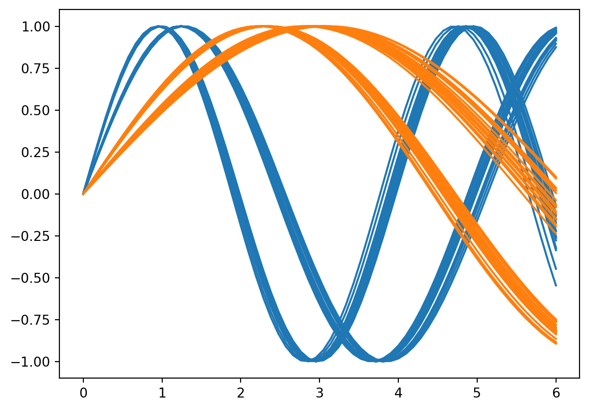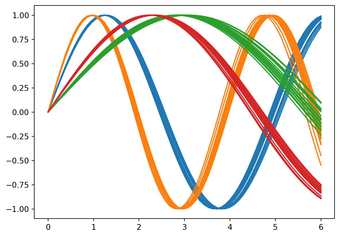 For a slightly more sophisticated example, let’s try to generate some related sin-curves from noise. Our linlinearity will come from a neural net.